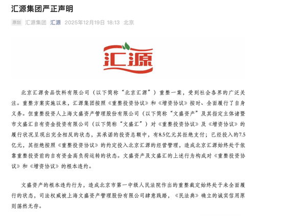 “承诺的投资总额中,有8.5亿元其拒绝支付;已经投入的7.5亿元,其拒绝按照约定投入经营管理。”12月19日,汇源集团通过官方渠道发布《严正声明》,以罕见的强硬措辞,直指其重整投资人上海文盛资产管理股份有限公司(下称“文盛资产”)及文盛汇(文盛资产参与北京汇源重整专门设立的持股平台公司)“根本违约”,甚至指控其行为“涉嫌合同诈骗罪”。