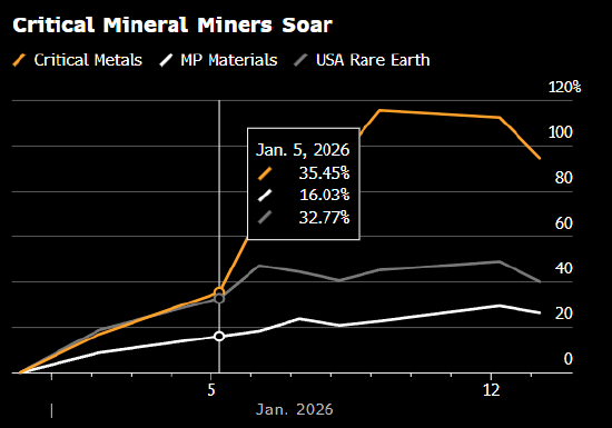 在特朗普政府官员公开讨论可能动用美军从丹麦手中夺取格陵兰的可能性后,拥有格陵兰资产、从事稀土矿物和锂勘探的Critical Metals Corp.股价上周飙升84%。格陵兰富含关键矿产。