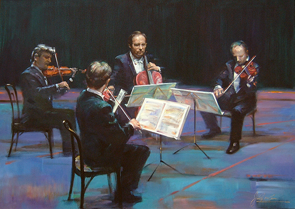 因音乐厅要在当年的10月1日翻新落成,甘锦奇在当年夏天多次往返上海,在音乐厅平移工地现场飞扬的尘土里耐心听工作人员为他详细描述这座建筑的历史和前景,在四楼巴洛克风格的大厅里细细抚摸延伸向高空的立柱,神情凝重地听设计人员向他表达心愿。虽然整个过程很少讲话,但他一直根据设计人员提出的需求仔细构思,回到美国后便开始创作。几天后,就寄回了两张样稿,一幅是里面包含国际著名指挥家伯恩斯坦的大型交响乐,另一幅则是民乐合奏,素材取自于中国民乐团在金色大厅的演出场景。如今,这两幅画面气势恢宏,凝重而潇洒的画作就悬挂于音乐厅二楼两侧的主墙上,而他的那幅《四重奏》则被收藏在了贵宾室里。