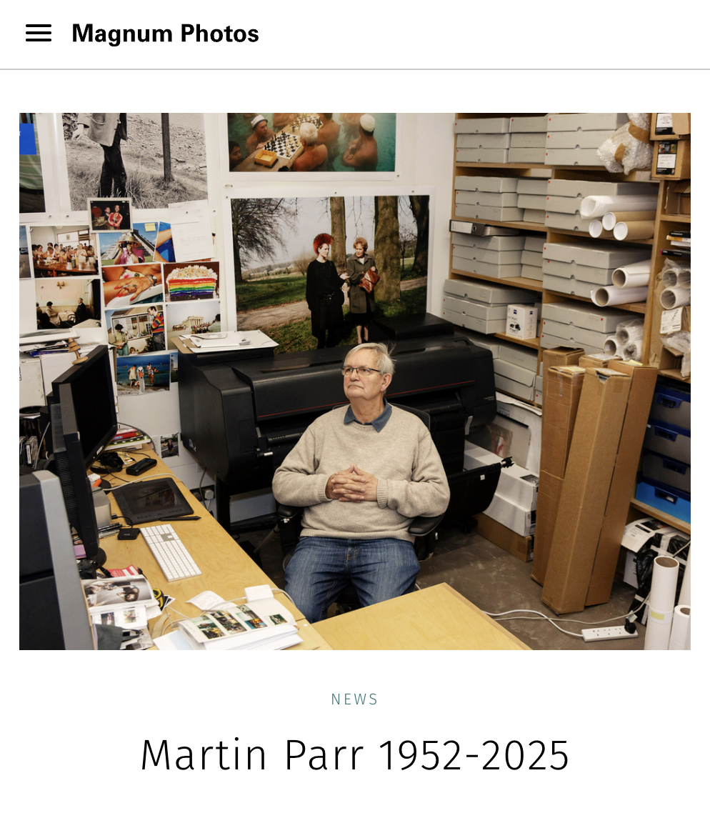 2025年12月7日,据马格南图片社消息,英国摄影家马丁帕尔(Martin Parr)昨日在英国布里斯托家中去世,享年73岁。2021年,他罹患癌症。马丁帕尔基金会和马格南图片社将携手合作,保护并分享马丁的遗产。