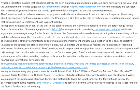图表3:美联储货币政策声明对比(2025年12月vs 2025年10月)