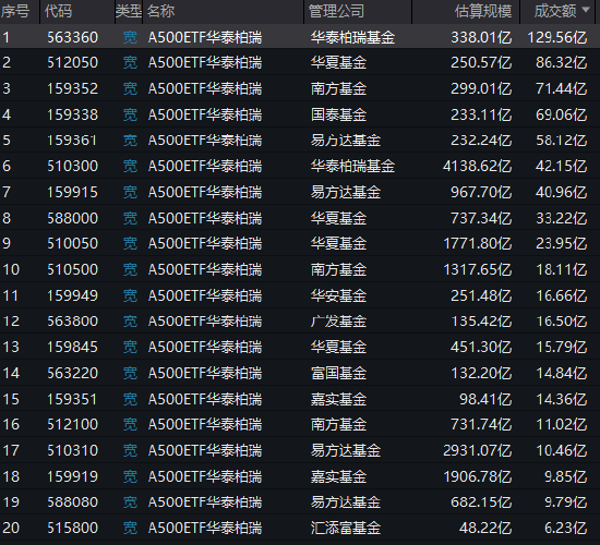 正文 多只宽基ETF午后放量异动:四只主流沪深300ETF今日成交额68亿元,华泰柏瑞A500ETF今日成交额130亿 亿通速配 V管理员 /2025-12-17 14:30:03/1阅读/0评论 1217 文章最后更新时间2025年12月17日,若文章内容或图片失效,请留言反馈! 12月17日消息,午后多只宽基ETF放量异动,沪深300ETF(510300)最近半小时成交超9亿元800ETF(515800)、沪深300ETF易方达(510310)、嘉实沪深300ETF(159919)最近半小时均成交超1亿元。 截止发稿,四只主流沪深300ETF成交额68亿元。 华泰柏瑞A500ETF(563360)今日成交额130亿元。